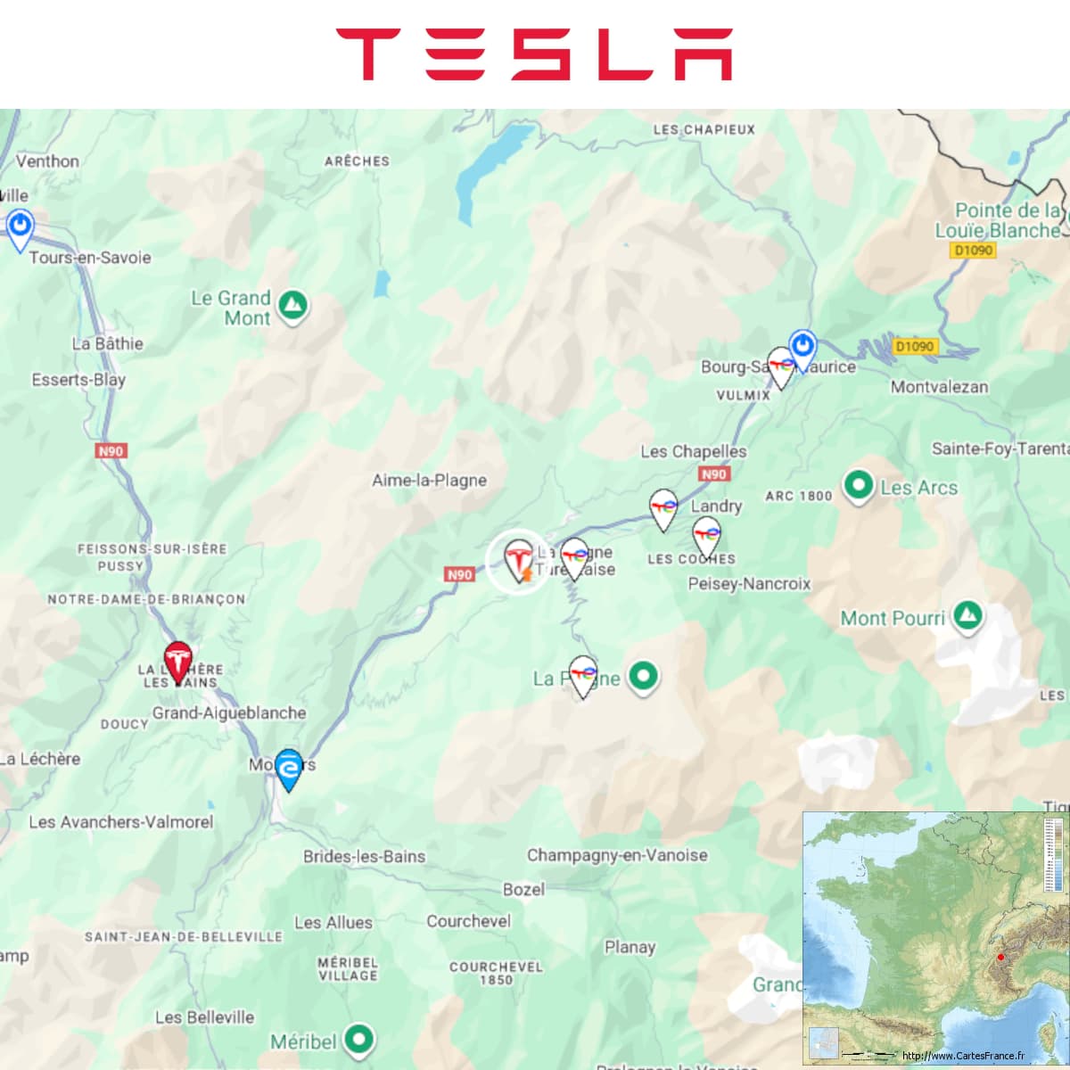 Ouverture à tous d’une station Tesla à Aime-la-Plagne (E. Leclerc).