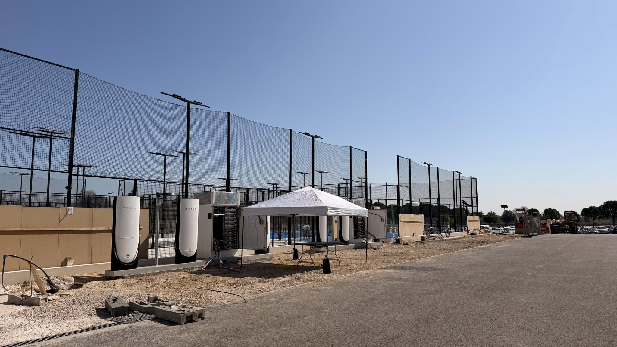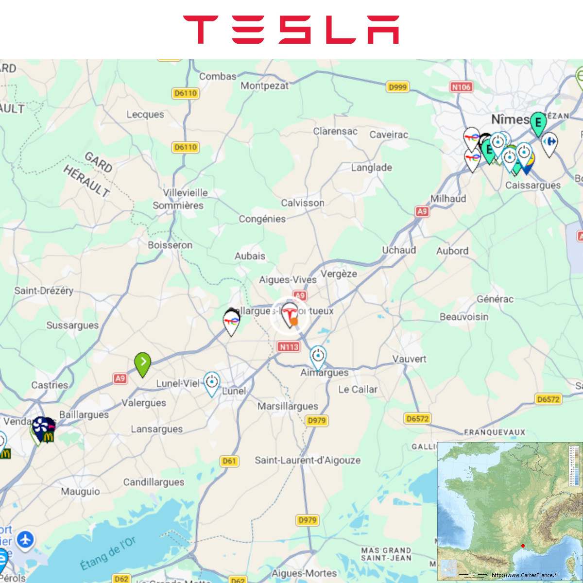 Construction d’une station Tesla à Gallargues-le-Montueux, Le long de l’A9 entre Montpellier et Nîmes .