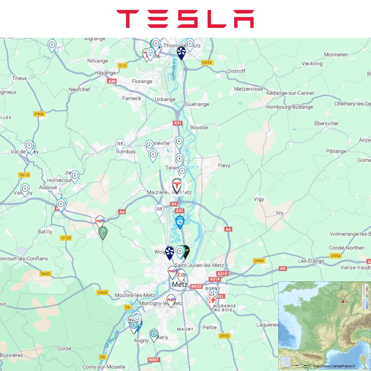 Agrandissement terminé d’une station Tesla à Hauconcourt (E. Leclerc).