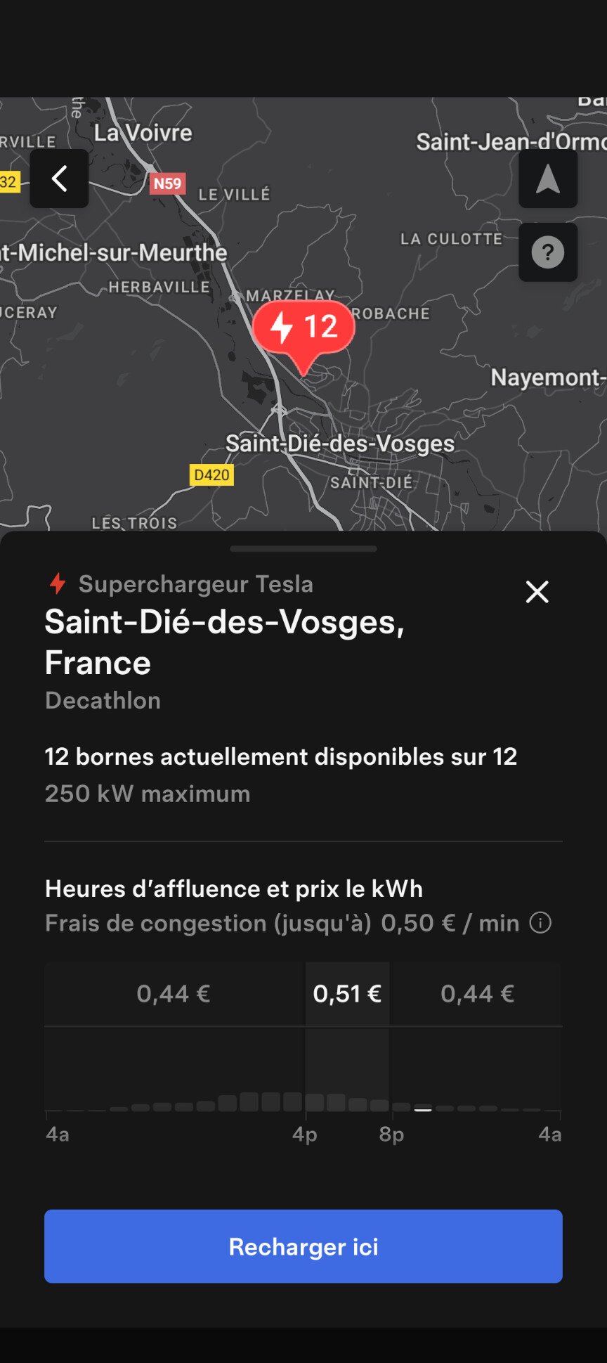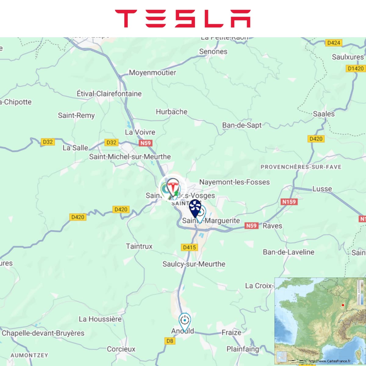 Agrandissement terminé d’une station Tesla à Saint-Dié-des-Vosges (Décathlon).